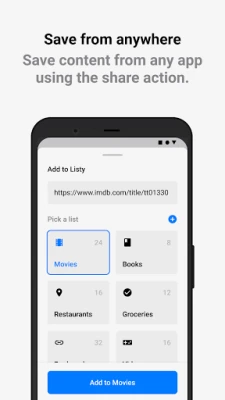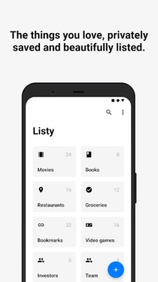 Listy is a tool to keep track of your favorite things privately using lists. You can save in the same app your favorite restaurants, movies, books, video games or anything you want.