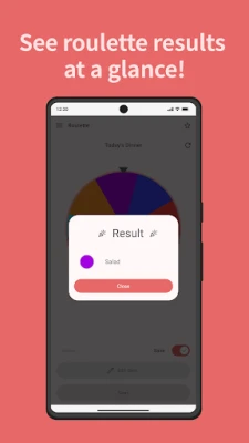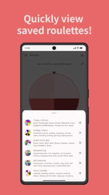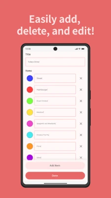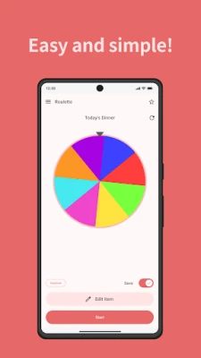 - Easy Operation: Add and edit options with just a tap. Perfect for beginners. - Free Customization: Create your own personalized roulette for any situation. - Save Function: Save your created roulettes and use your favorites as many times as you like. - Versatile Uses: Ideal for various everyday scenarios like choosing lunch or dinner, deciding on travel destinations, picking outfits, games, and organizing events. - Simple and Intuitive UI: Enjoy a comfortable roulette experience with a refined design.